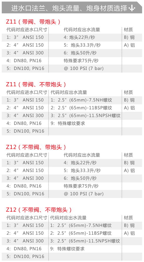 — 当定购保护神固定消防炮时,请在相应表格内寻找所需要规格代号。例如型号Z1125B。11指炮身带阀,2指进水口法兰为4" ANSI 150, 5指炮头流量为33.3升/秒,B指炮身为铜质。炮头流量为7bar压力下标定数值